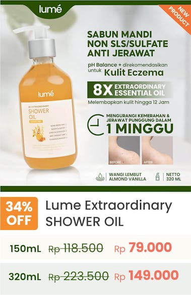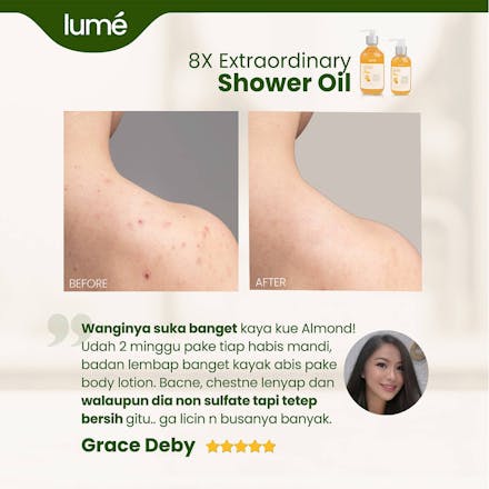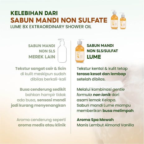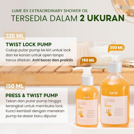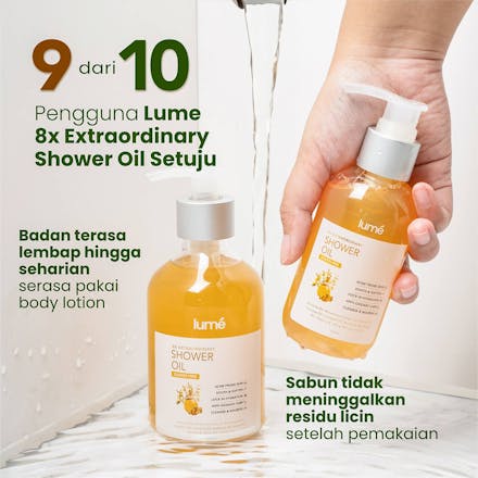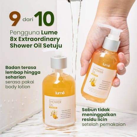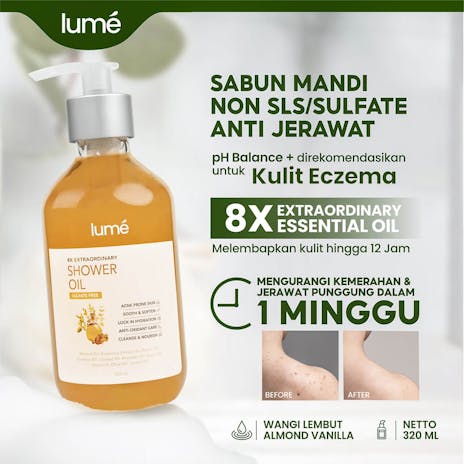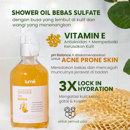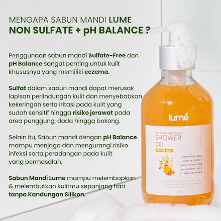 Lume Shower Oil berfungsi sebagai pembersih tubuh yang lembut, tidak membuat kulit kering dan aman digunakan untuk kulit yang sensitif maupun kulit yang berjerawat, karena bebas dari sulfat dan paraben.