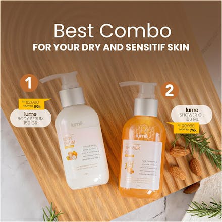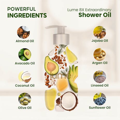 Formulasi 8 minyak esensial berkualitas tinggi seperti almond oil, coconut oil, sunflower oil, linseed oil, avocado oul, argan oil, olive oil, dan jojoba oil dapat membantu menenangkan dan melembutkan kulit , serta memberikan nutrisi yang dibutuhkan untuk menjaga kulit tetap sehat dan lembut. Kandungan lain seperti Vitamin E pada Lume Shower Oil juga berperan penting sebagai anti-oksidan. Lume Shower Oil ini juga dapat memperbaiki kulit yang kering, gatal dan kusam.