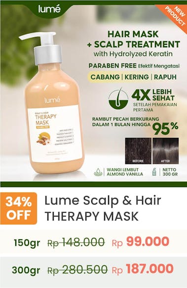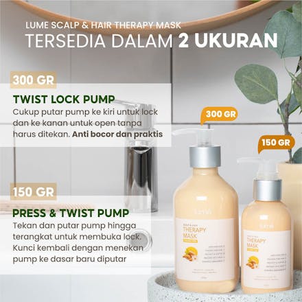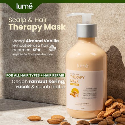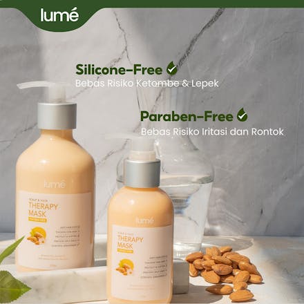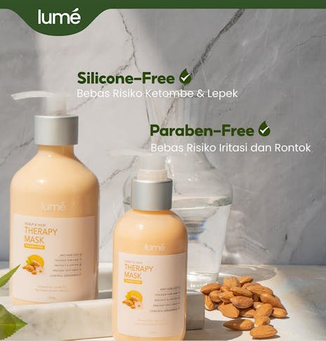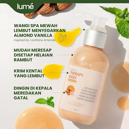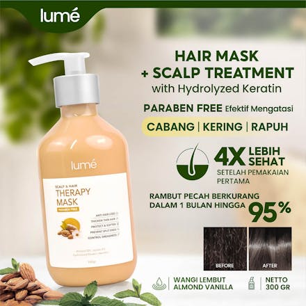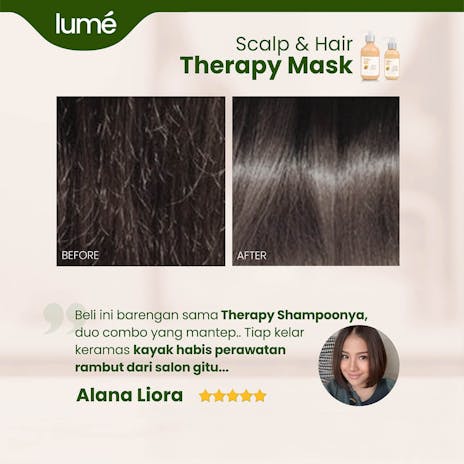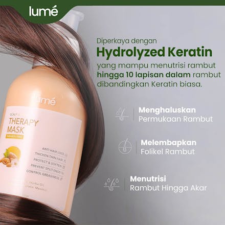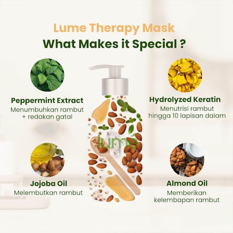 Lume Therapy Mask memiliki kandungan khusus seperti Hydrolyzed Keratin, yang mampu menutrisi rambut hingga 10 lapisan dalam rambut dibandingkan keratin biasa. Sehingga, permukaan rambut menjadi halus, folikel rambut lembap dan Menutrisi akar hingga ujung rambut dengan sempurna.